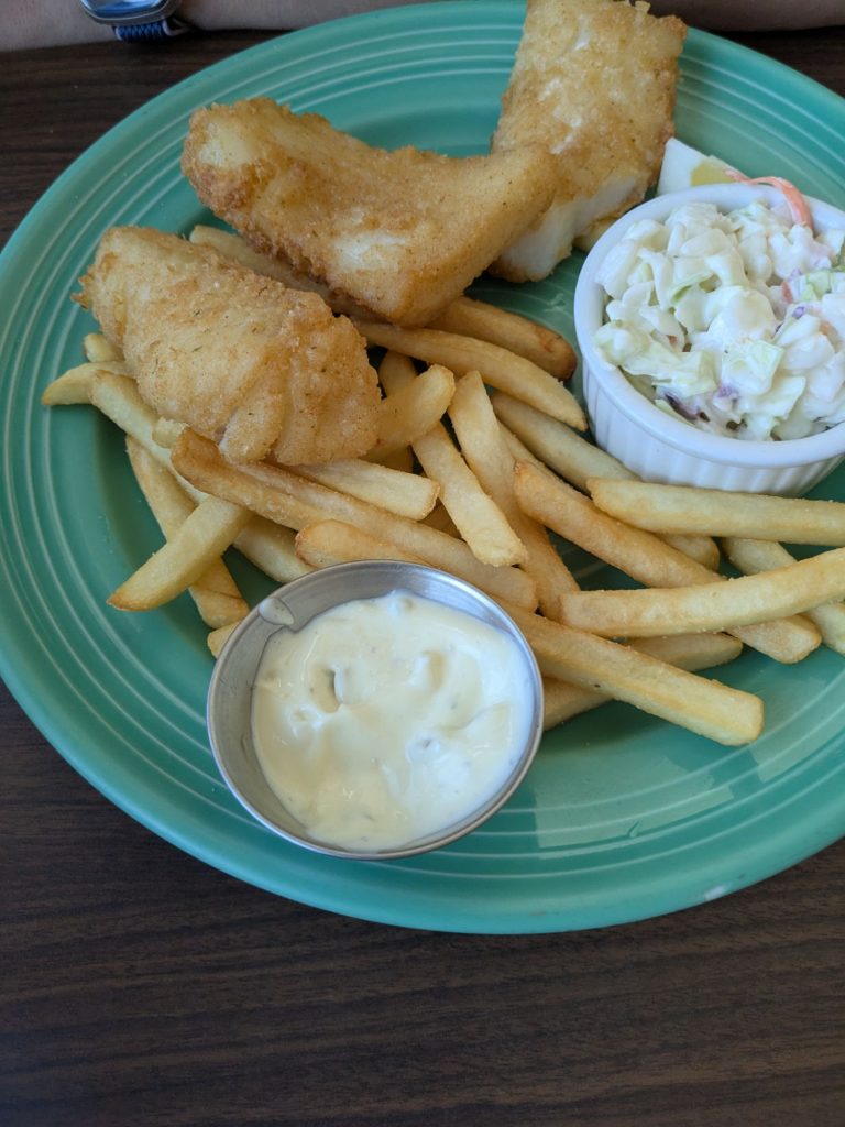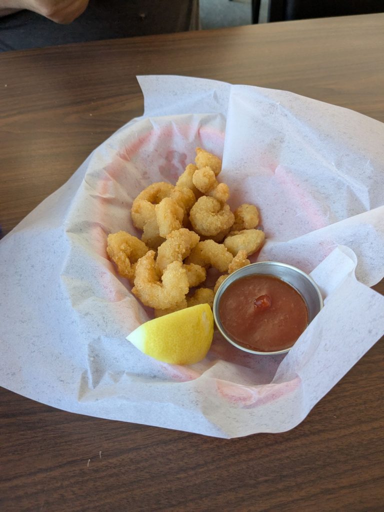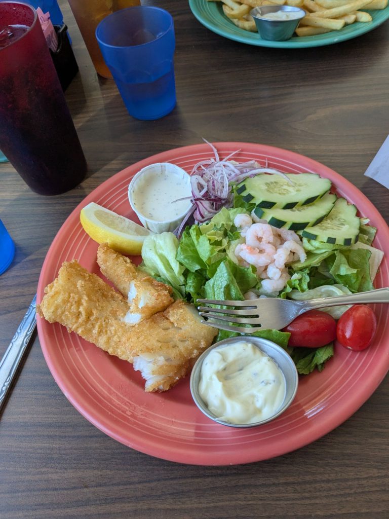 Once upon a time, when we were young and not quite wise, we got married at the ripe old age of 19. As I mentioned not quite wise; but we’ve made it work through some dungeons, fought a variety of monsters and both collected and spent a variety of loot. We’ve brought four spawn into the world and their greatness makes it a better place. So to celebrate our quarter of a century of being shackled we went to lunch here:The husband had fish and chips and coleslaw.I had fish and a salad with lovely little shrimps on top.And we shared a popcorn shrimp appetizer.